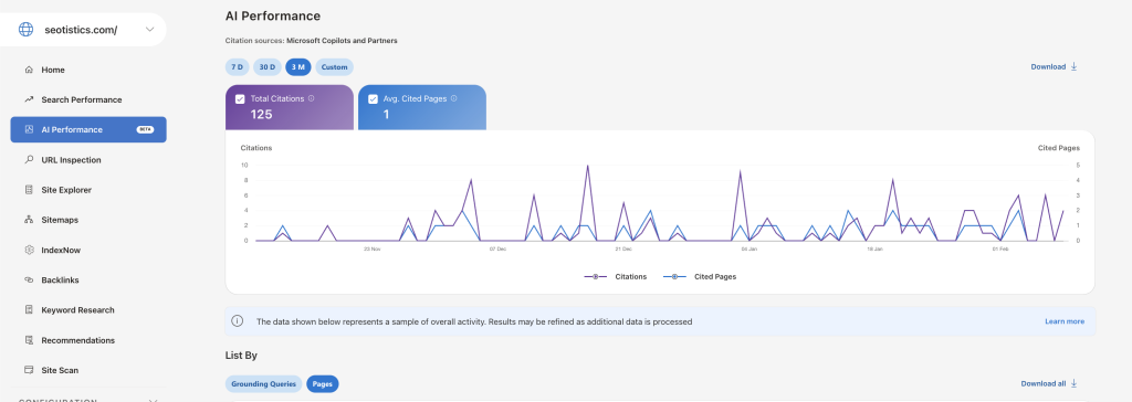 - Citations: how many times your website is used as a source by Copilot.